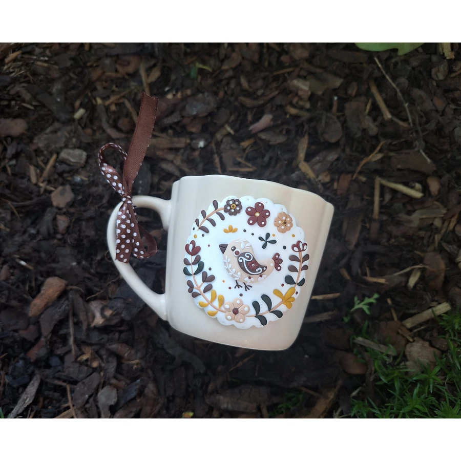 Süthető gyurmával díszített kerámia bögre. A belseje mintás (nem gyurma). Az ár csak a bögrét tartalmazza.