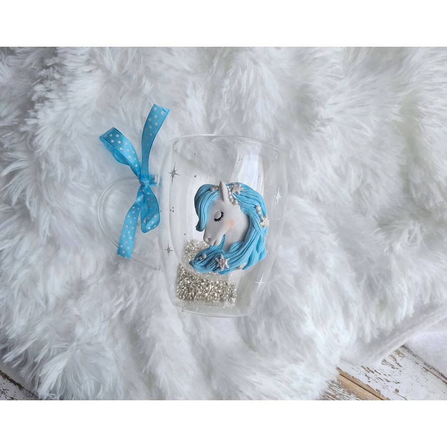 Süthető gyurmával díszített duplafalú üveg bögre, a két réteg között ezüst golyók vannak. Rázáskor gyönyörűen szóródnak a két üveg réteg között.